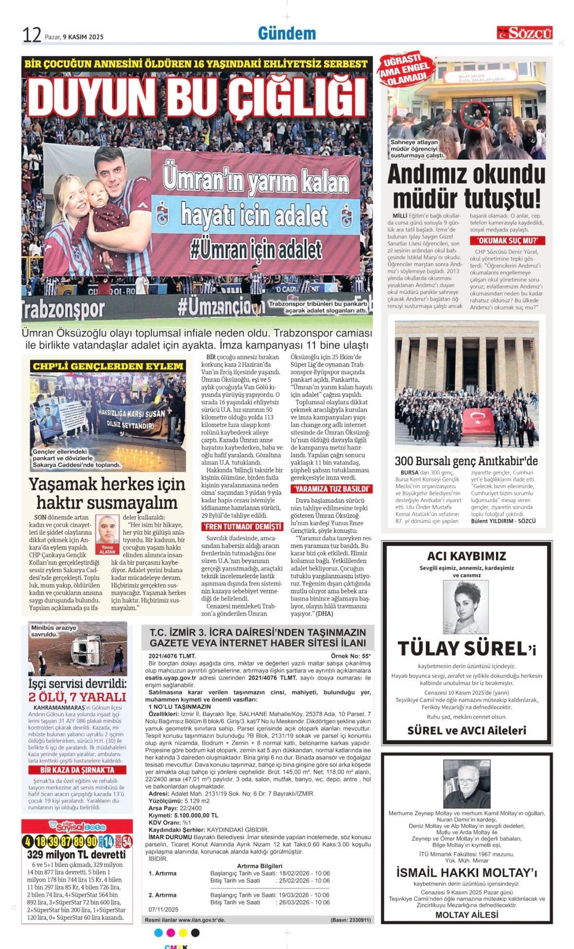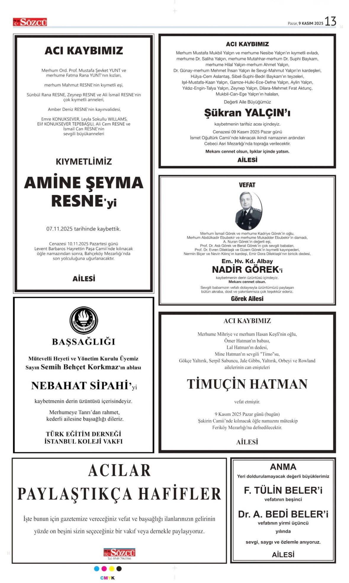 Sözcü Bugünkü Vefat İlan- Başsağlığı İlanı- Anma İlanları ve Arşiv Sayfalar. 9.11.2025